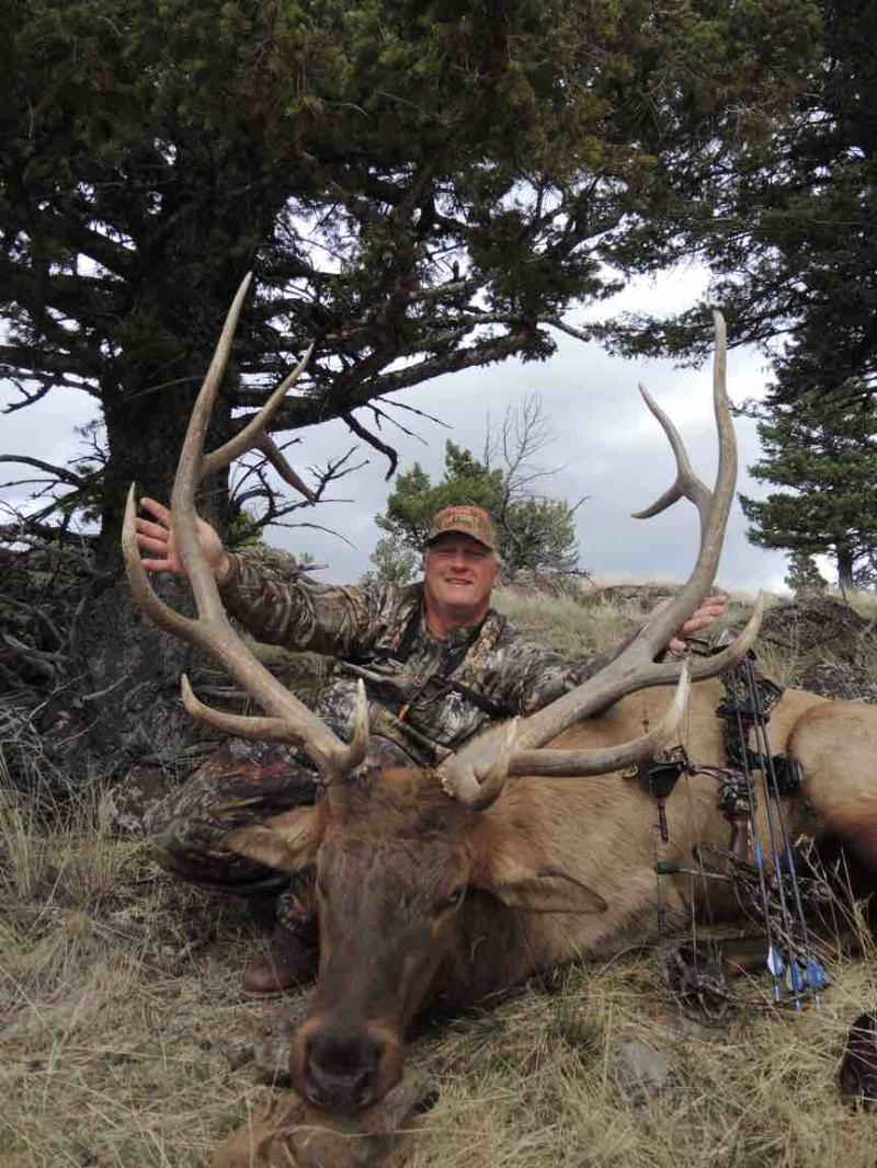 Marty Lawley with his fantastic elk taken with a bow in Montana. After belly-crawling through thick brush and a surprise rattlesnake sighting, Marty was still able to steady himself for the shot!