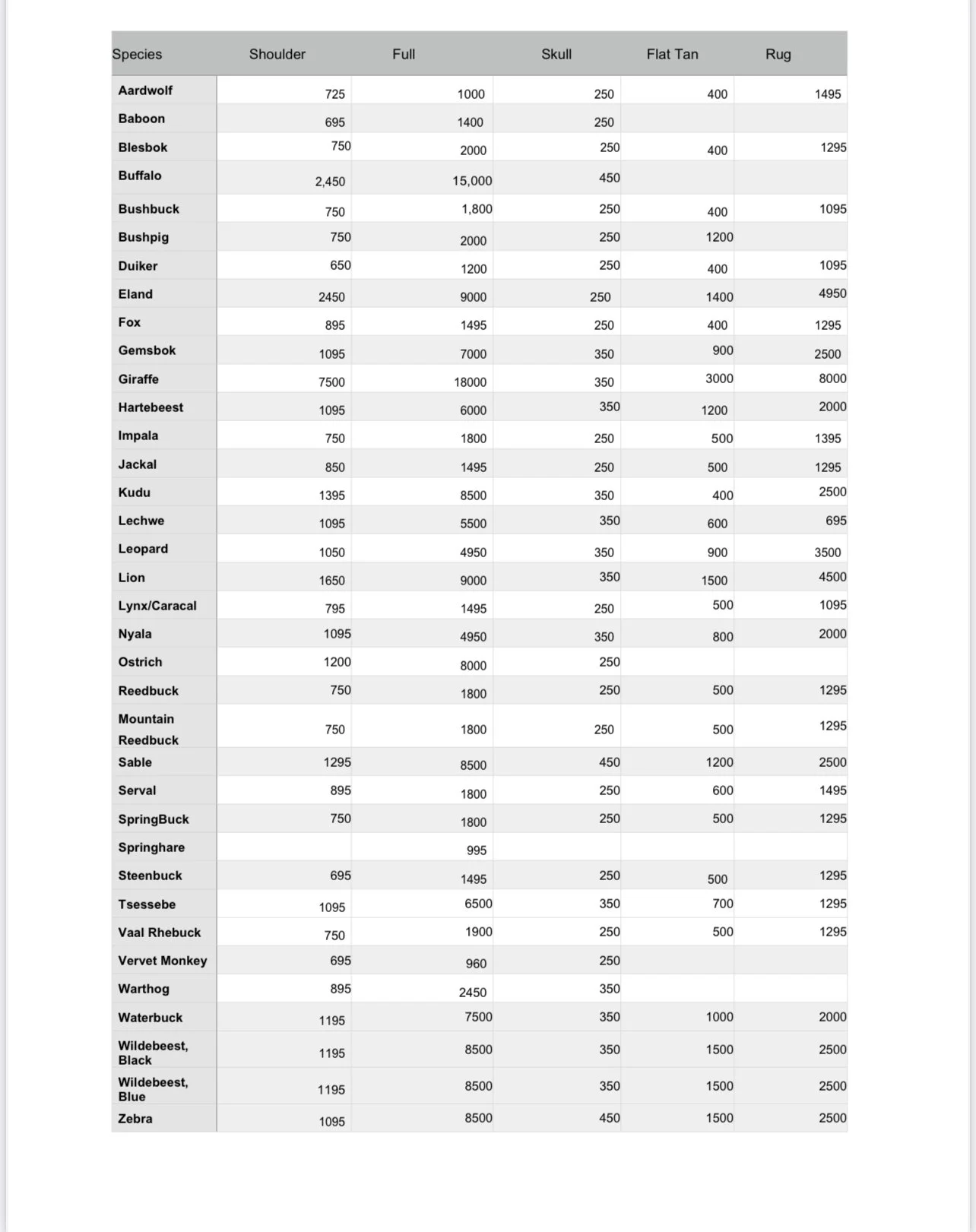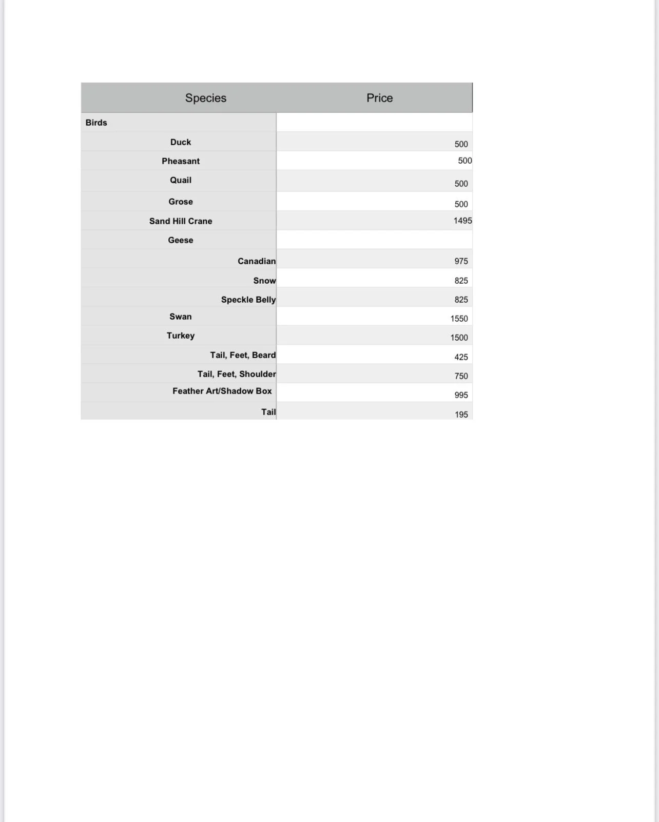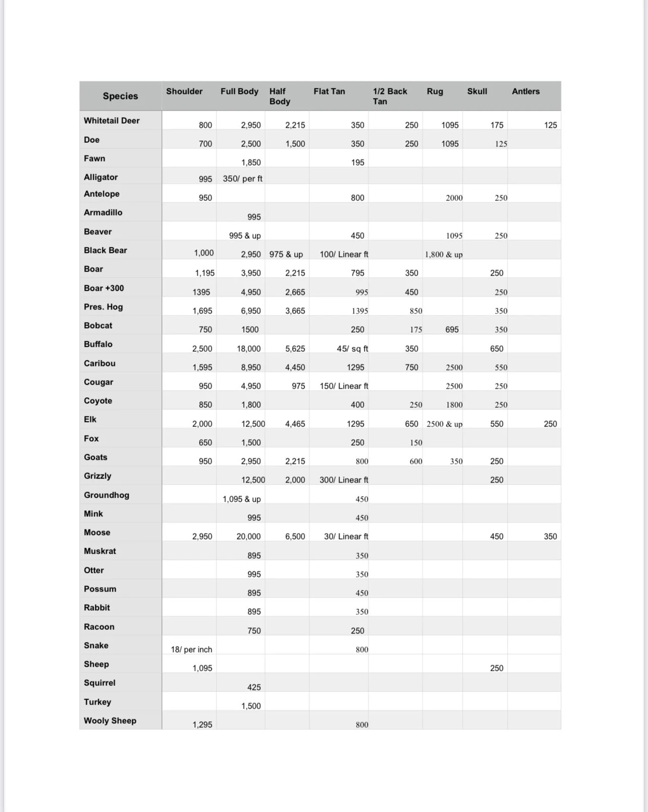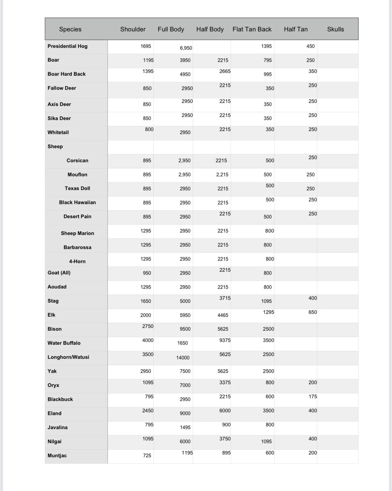 HICKS TAXIDERMY PRICE LIST 2025-2026